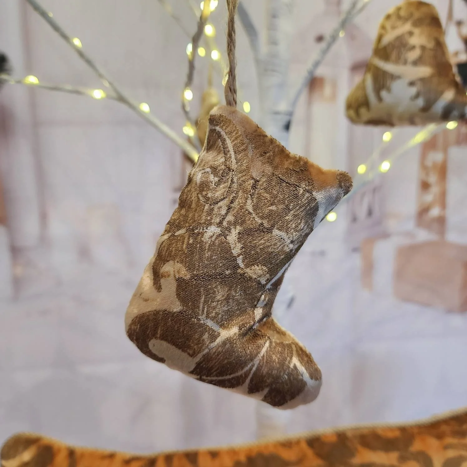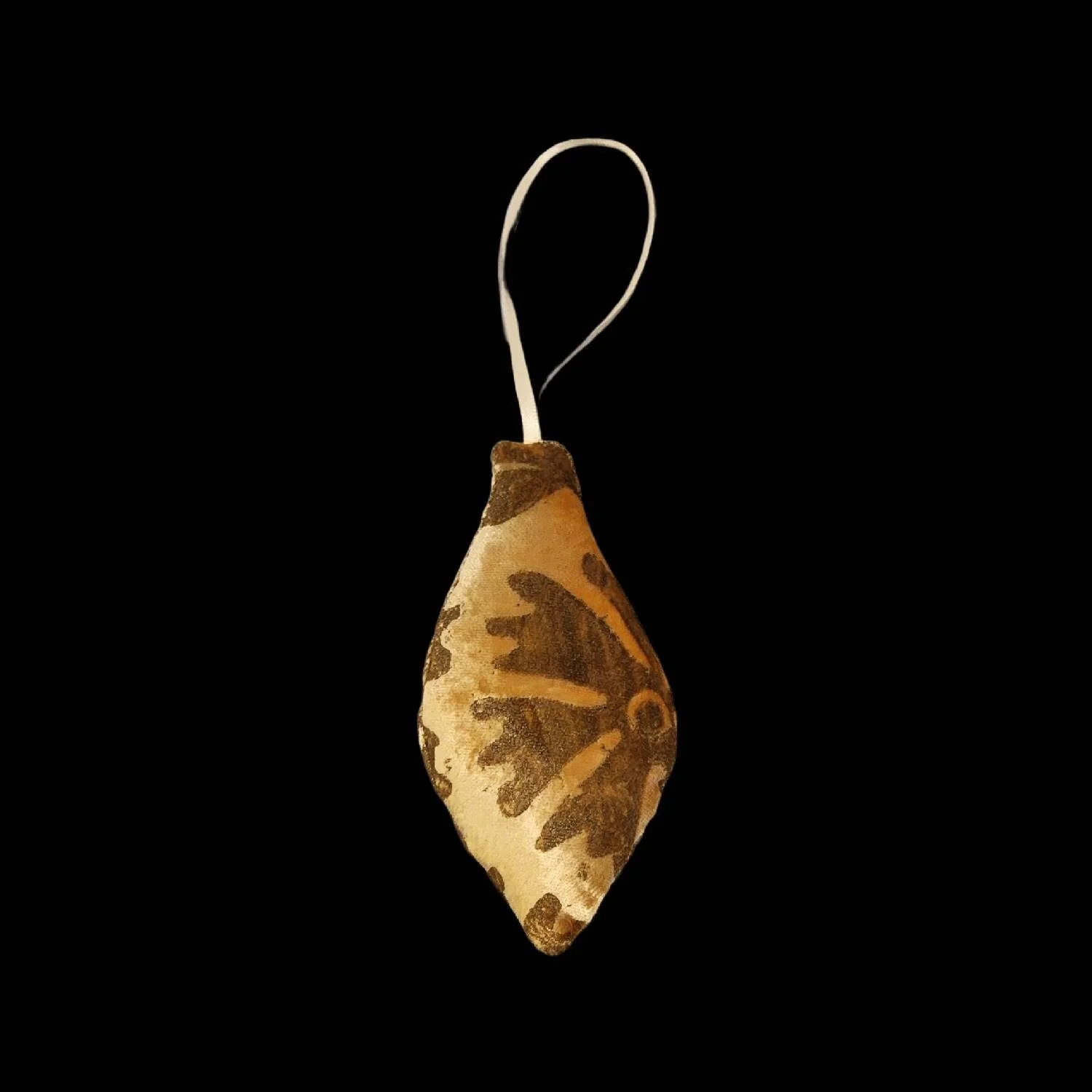 Each ornament features the same Bennison fabric on both sides, meticulously stripe-matched for a seamless, tailored finish. They are filled with soft poly-fill and accented with a charming wooden star and natural jute rope for hanging.